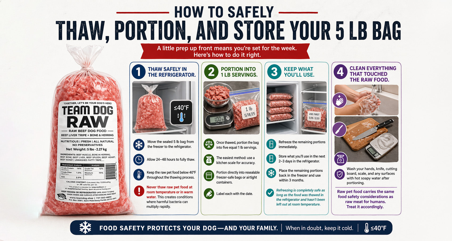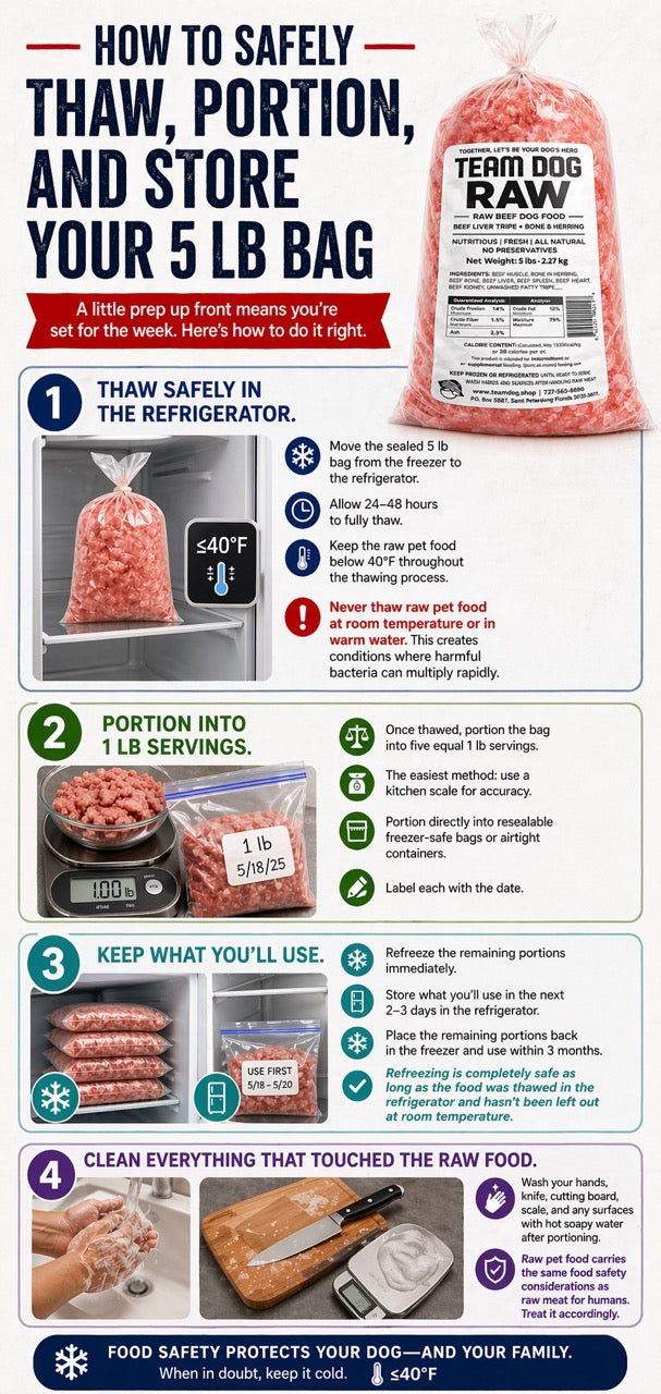 Each Team Dog Raw order is shipped in its own dedicated cooler for freshness and quality. Once you receive your order, freeze any items you won’t use right away. If any of your products arrive thawed or starting to defrost, don’t worry or panic. It’s perfectly safe to thaw and re-freeze pet food.